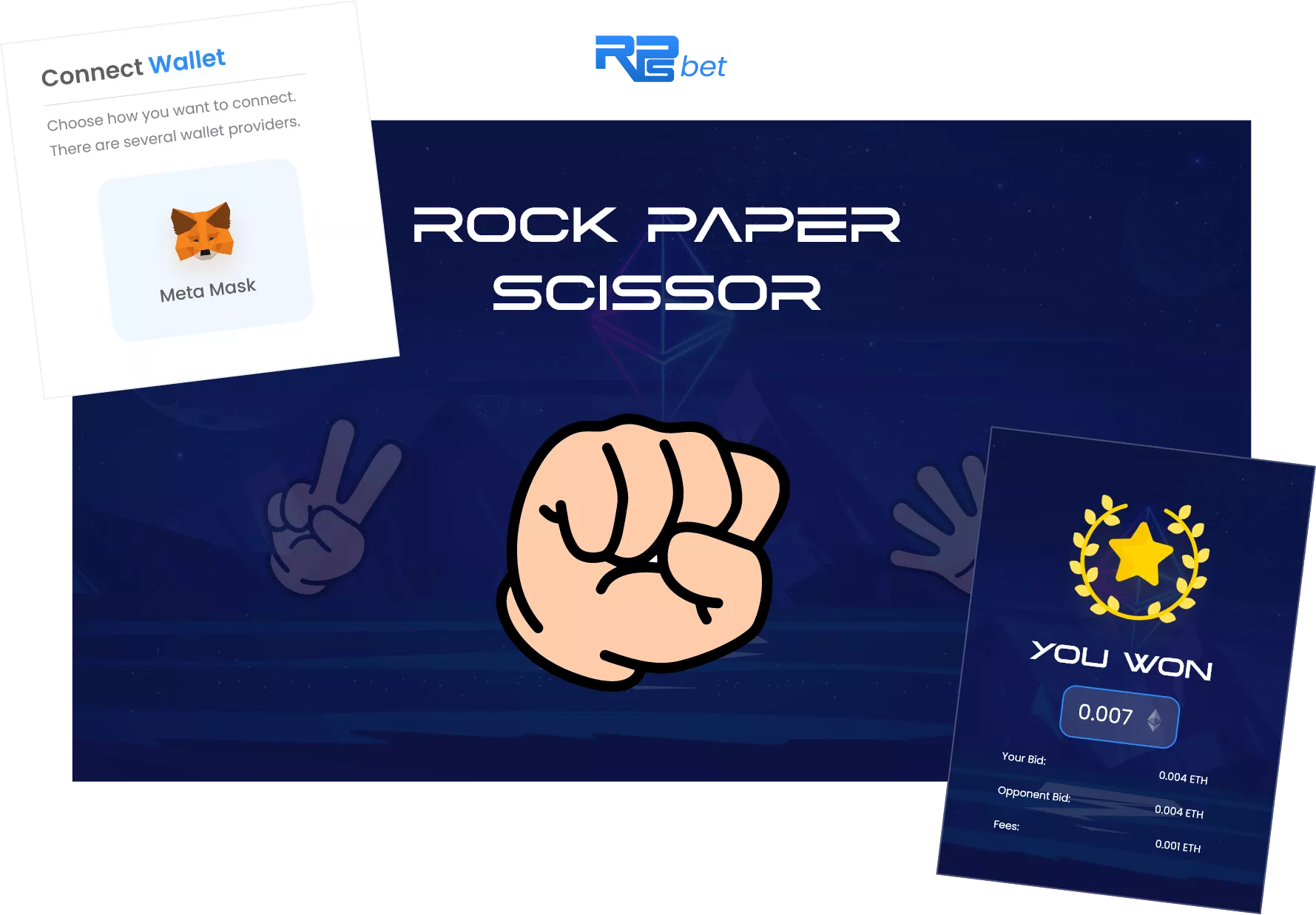 Play Rock, Paper, Scissors crypto game with Metamask and ETH. Bet against real-time players and a PC bot for a chance to win instantly. One round only.